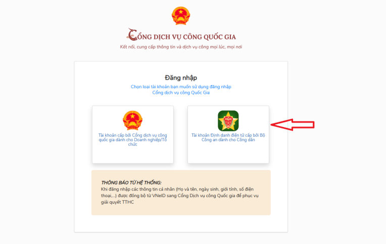 Sau đó, chọn Tài khoản Định danh điện tử cấp bởi Bộ Công an dành cho Công dân để đăng nhập vào Cổng dịch vụ công Quốc gia.