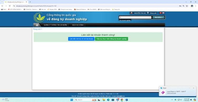 Tại đây người dùng có thể tùy chọn thực hiện liên kết chữ ký số với tài khoản hoặc tiếp tục thực hiện đăng ký doanh nghiệp.