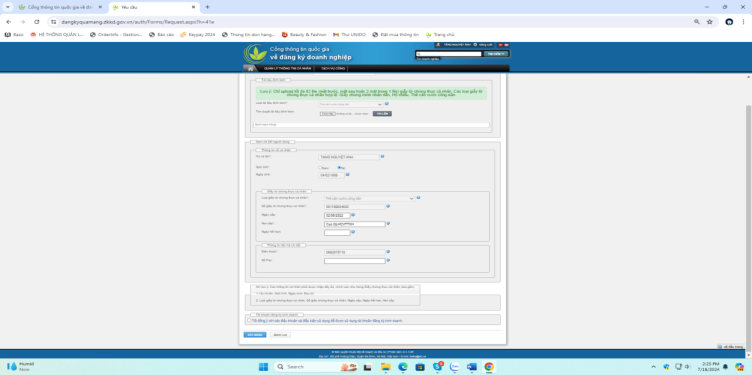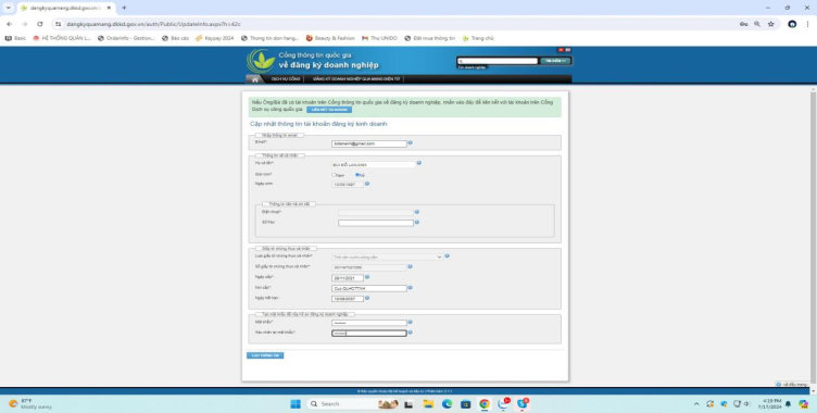 Sau khi nhấn nút tạo mới tài khoản ĐKKD, Hệ thống sẽ hiện ra màn hình cập nhật thông tin tài khoản đăng ký kinh doanh, người dùng cần nhập email, các thông tin còn trống trên màn hình và nhập mật khẩu để nộp hồ sơ đăng ký doanh nghiệp rồi nhấn nút [Lưu thông tin].