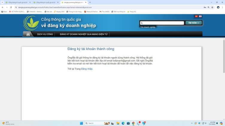 Hệ thống sẽ hiện ra màn hình thông báo như hình ảnh dưới đây, người dung mở liên kết kích hoạt tài khoản được gửi tới email để hoàn tất việc đăng ký tài khoản.