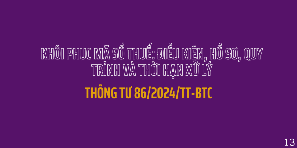Khi doanh nghiệp, hợp tác xã, đơn vị phụ thuộc, tổ chức kinh tế, hộ/cá nhân kinh doanh thuộc các trường hợp được khôi phục mã số thuế (MST) theo Thông tư 86/2024/TT-BTC, người nộp thuế cần nộp hồ sơ đúng thời hạn để khôi phục trạng thái pháp lý, tiếp tục hoạt động và thực hiện nghĩa vụ thuế bình thường. Bài viết này tổng hợp trường hợp áp dụng, hồ sơ, trình tự, thời hạn và kết quả theo quy định mới nhất.